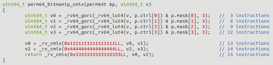It looks like we are going to add a lut4 instruction to RISC-V BitManip (it's being moved from the crypto extension to bitmanip because it has many uses outside of crypto). Here's a little demo I wrote for it. Arbitrary 64-bit bit permutation in 15 instructions.pic.twitter.com/3n7TLLXdpU
