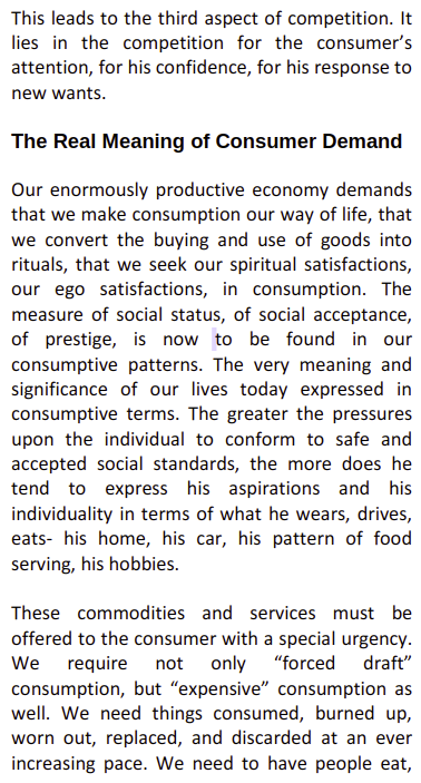 "Our enormously productive economy demands that we make consumption our way of life, that we convert the buying and use of goods into rituals, that we seek our spiritual satisfactions, our ego satisfactions, in consumption." -- Victor Lebow (1955)https://twitter.com/peachcrisis/status/1314963930305957890 …
