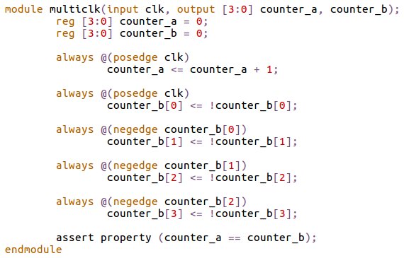I just added Yosys-SMTBMC support for multiple clock domains. For example, it can now prove that the property in this demo holds:pic.twitter.com/UaTs8wBqDS