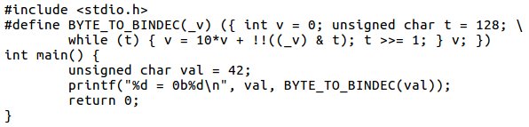 typedef struct {char a[9];} t; t b(uint8_t x) { t s; for (int i=8; i>0; x>>=1) s.a[--i]=48+(x&1); s.a[8]=0; return s; }