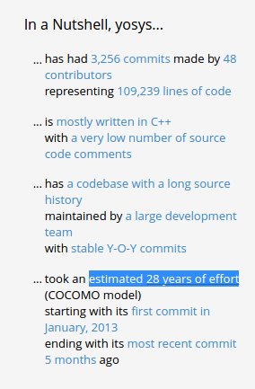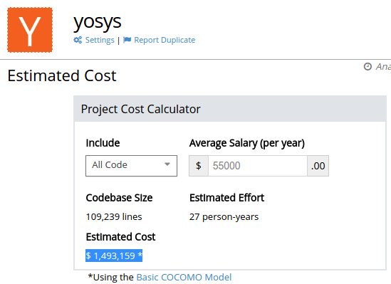 OpenHub thinks there are 28 person-years of effort in Yosys. I only remember 5 years.. Also: $ 1,493,159 !? https://www.openhub.net/p/yosys pic.twitter.com/GizDg57Zxr