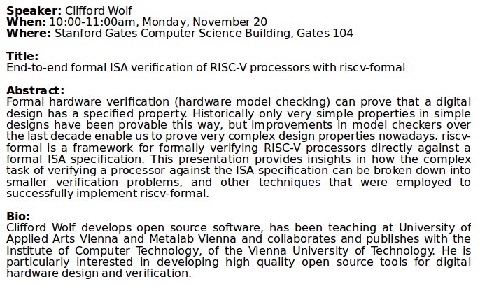 I'll give a presentation on riscv-formal at Stanford on Monday, November 20, 10:00-11:00am (Gates 104). Unlike the event at Google last week this one is going to be open to the public. See you there!pic.twitter.com/Y1xDUendq6