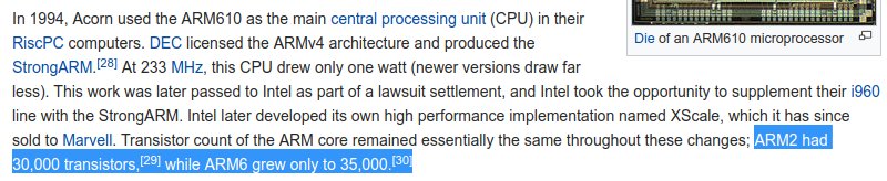 - http://www.wagnercg.com/Portals/0/FunStuff/AHistoryofMicroprocessorTransistorCount.pdf … - https://en.wikipedia.org/wiki/Transistor_count#Microprocessors … - https://www.chiark.greenend.org.uk/~theom/riscos/docs/ultimate/a252arm6.txt … - https://en.wikipedia.org/wiki/ARM_architecture#Early_licensees … I'd say "ARM6 was certainly <30K" is certainly false. ;)pic.twitter.com/8W801NE6pO