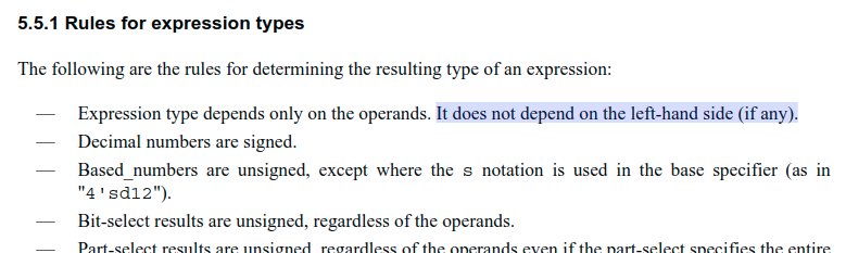 From the simulation traces I've been shown and the proposed patch it looks like VCS is (at least in some situations) using the LHS of an assignment to determine the signedness of the RHS expression. That is of course *not* how Verilog works. (See 5.5.1 of IEEE Std 1364-2005.)pic.twitter.com/eTSafVIAu4