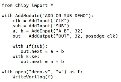 A little preview of Chipy, a Python API for creating Verilog code generators. (PM me for the link to the svn repo.)pic.twitter.com/0mgf8ra61o