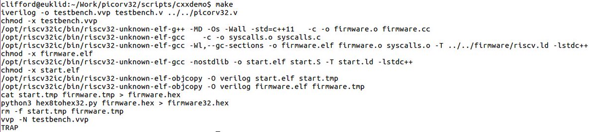 Testing updated riscv-gnu-toolchain with PicoRV32 infrastructure... Well, shit. I guess I now know what I'll do tonight.. (It might just be a change in the upstream linker scripts that I need to replicate in mine. Fingers crossed.)pic.twitter.com/eCk8peY7rX