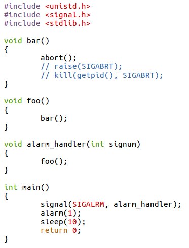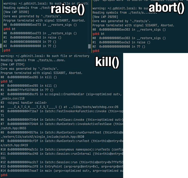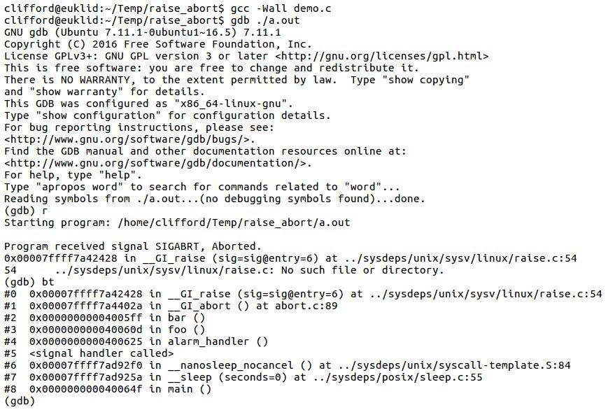 Are you on Linux? Do you want to get good backtraces from an asynchronous signal handler? Do not use abort(3). It generates terrible backtraces, use kill(getpid(), SIGABRT).