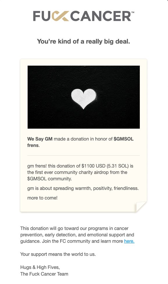@Rahul_Sundar07 and@letsfcancer for winning the first$GMSOL community charity airdrop! we have made a 500k$GMSOL donation ($1100) to@letsfcancer follow and join discord for more of these to come very soon!pic.twitter.com/49qNSjJrUZ
