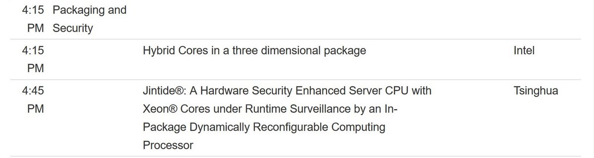 => Jintide CPU: x86 with PrC and DSC Reconfigurable computing Intel, Jan 20, 2016 https://twitter.com/ogawa_tter/status/690378993074360323 … 清华大、CPU硬件安全技术、2018年11月 https://twitter.com/ogawa_tter/status/1132453027191771137 … 澜起科技津逮 CPU具备多系列大批量供货能力、2019年5月 https://twitter.com/ogawa_tter/status/1132435896601464832 … Hot Chips 2019 https://www.hotchips.org/program/ pic.twitter.com/IYGD7m7AgW
