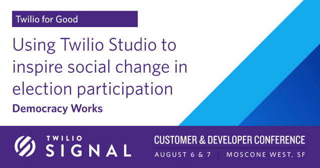 #SIGNALConf hear the story of how the@demworksinc team used Twilio Studio to implement and test best practices around getting people to vote — while their user base jumped by millions. http://bit.ly/2GiNLL0 pic.twitter.com/5YzTQpZDJd