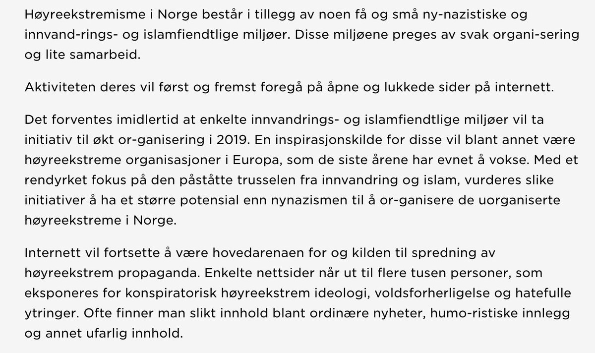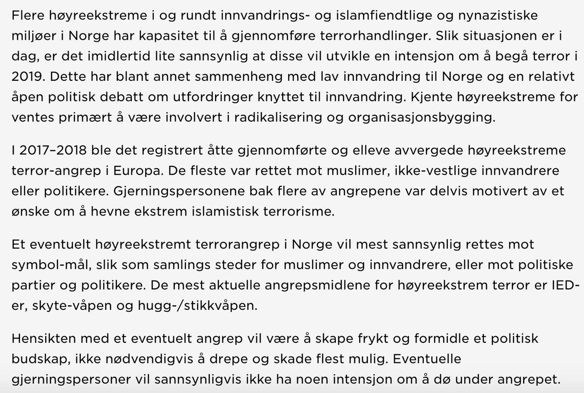 Dette sier Politiets sikkerhetstjeneste om faren for høyreekstrem terrorisme og ekstreme islamfiendtlige miljøer her til lands i den offentlige trusselvurderingen for 2019:pic.twitter.com/WenpR3X2V4