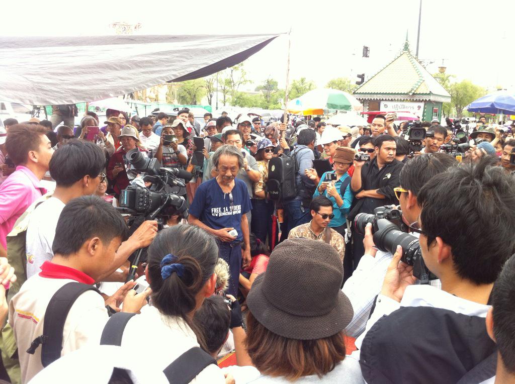 พ่อไผ่ ดาวดิน ชี้แจงกับสื่อมวลชนพร้อมพูดคุยกับผู้ชุมนุม หลังศาลทหารปล่อย 14 นศ.