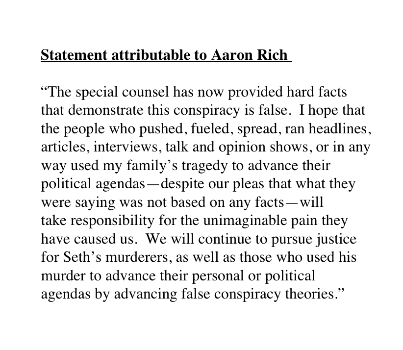 New: Seth Rich's brother, Aaron Rich, releases statement after Mueller findings: "I hope that the people who pushed, fueled, spread, ran headlines, articles, interviews, talk and opinion shows...will take responsibility for the unimaginable pain they have caused us."pic.twitter.com/88HfFGlN2z