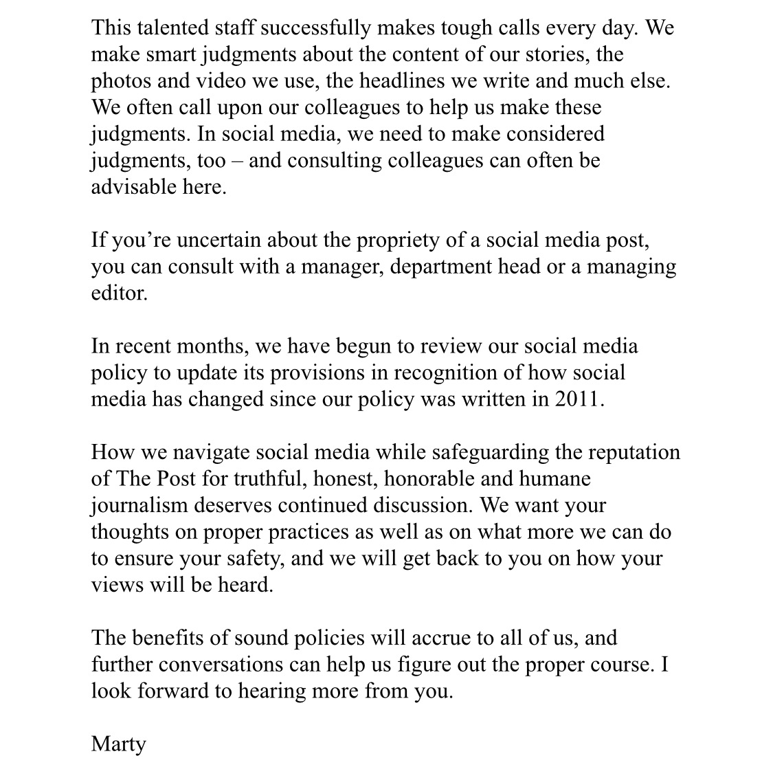 Marty Baron: "We count on staffers to be attuned to how their social media activity will be perceived .... We do not want social media activity to be a distraction, and we do not want it to give a false impression of the tenor of our coverage."