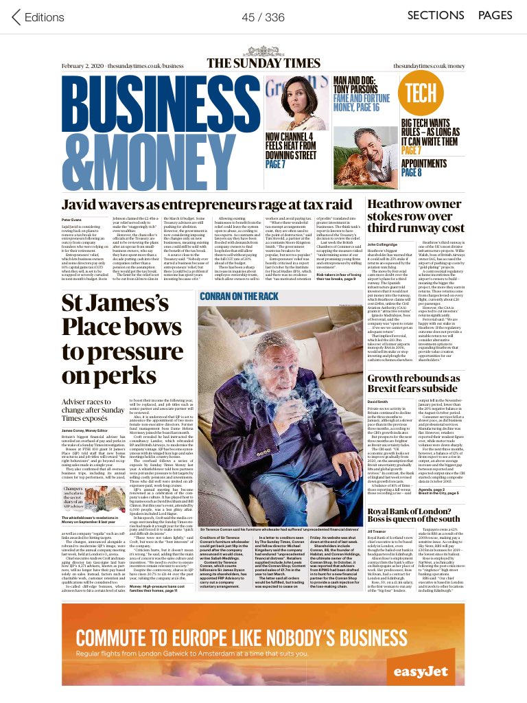 Today's ST Business: St James's Place bows to pressure on perks, Javid wavers as entrepreneurs rage at tax raid, Heathrow owner stokes row over third runway, Conran on the rack, growth rebounds as Brexit fears subside and RBS boss is queen of the southpic.twitter.com/XfSWQEYPXD