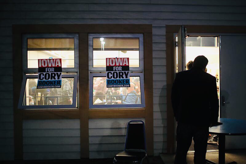People listen as Sen. Corey Booker speaks during a campaign stop in Des Moines, Iowa on Tuesday.