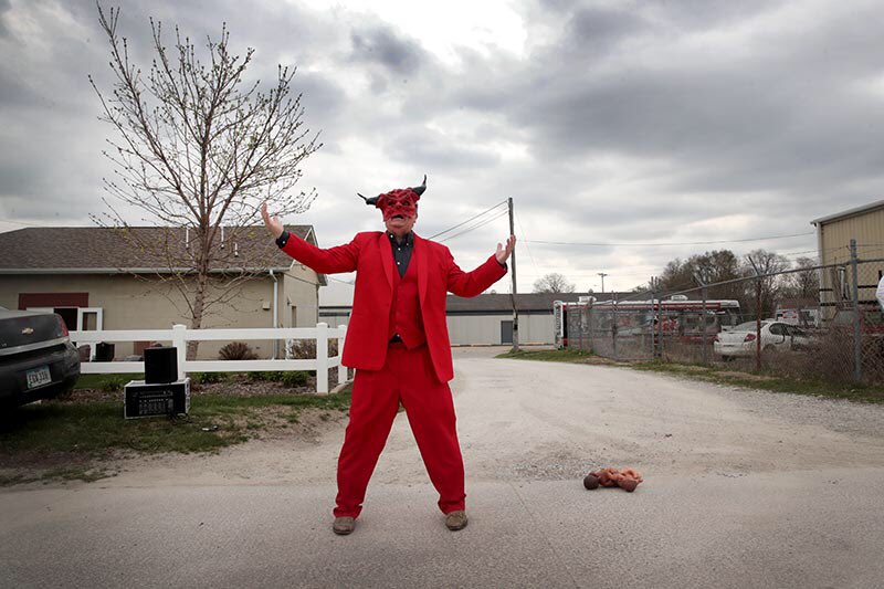 The devil in the form of Randall Terry, a pro-life, anti-gay activist, appears outside of a Pete Buttigieg campaign event in Des Moines, Iowa.