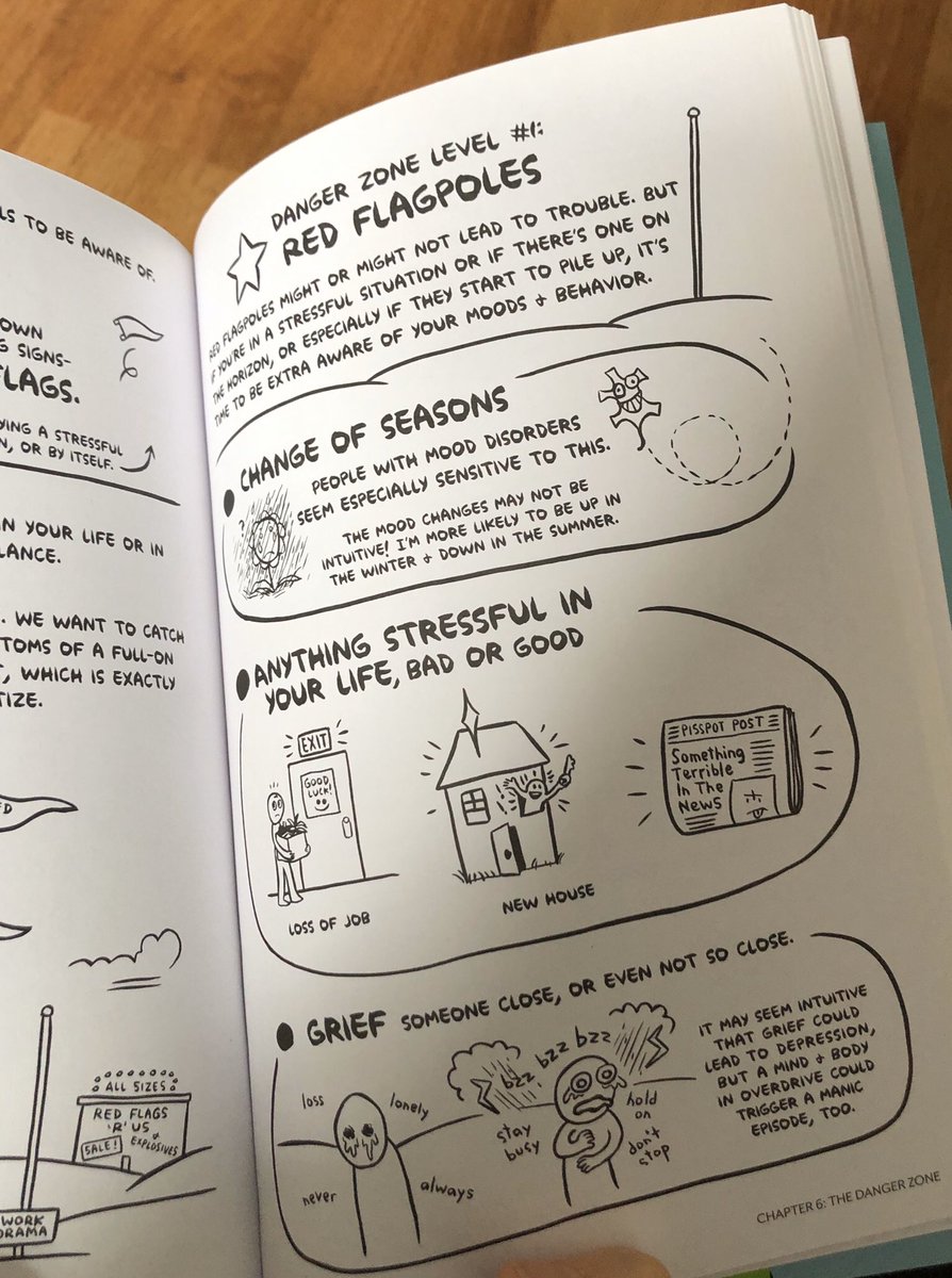 Love these mental health danger zones from Ellen Forney. It took me years to identify these. - Anything stressful (bad or good!) - Decreased sleep - Altered routines - Travel - Grief/loss - Treatment & disclosure stuff - Isolation - Illness/injury - Change of seasons/weatherpic.twitter.com/FgbPnvRkac