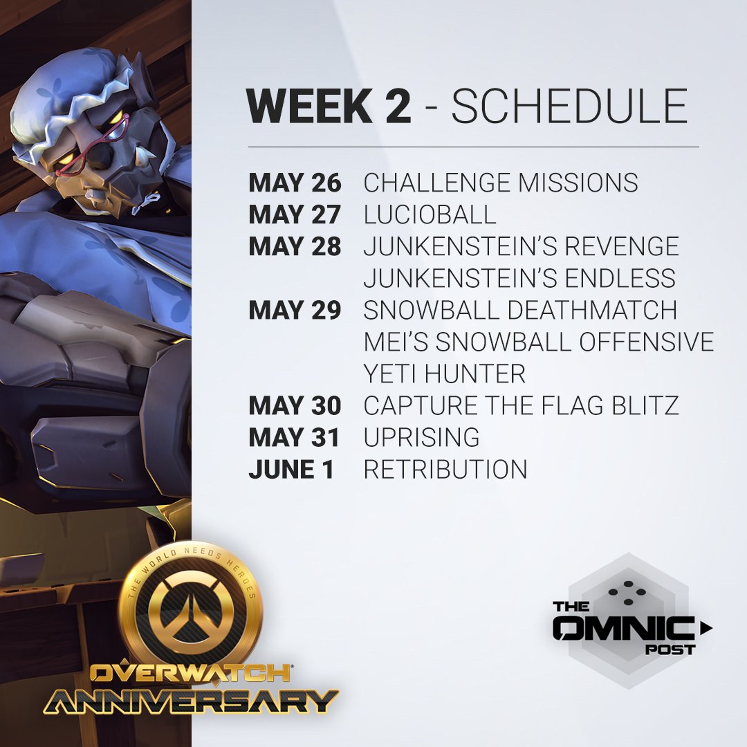 The schedule for the second week of the 2020 Anniversary brawls. Find them in the arcade tab. #overwatch #overwatch2 #blizzard