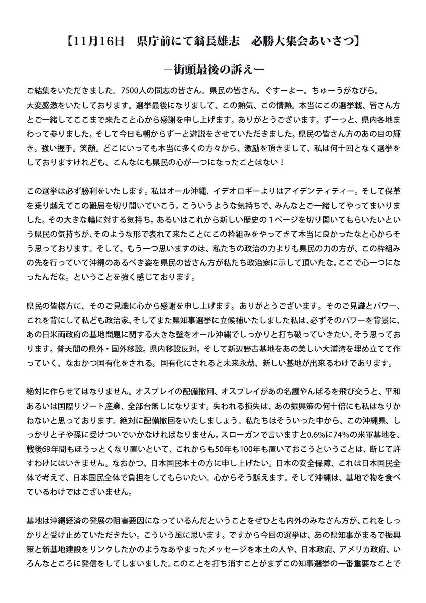 【翁長雄志 必勝大集会あいさつ】-街頭最後の訴えー ご結集をいただきました。7500人の同志の皆さん。県民の皆さん。ぐすーよー。ちゅーがなびらー。大変感激をいたしております。pic.twitter.com/PG5ZA5yxbA