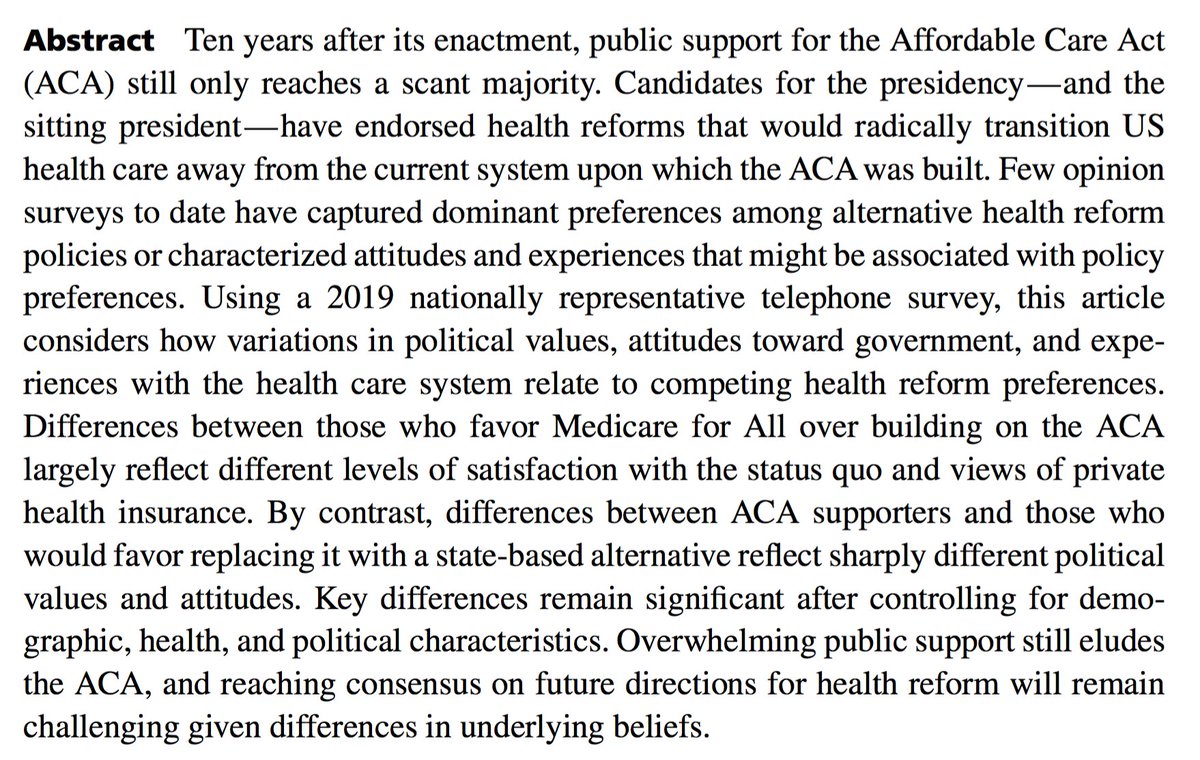 Very excited to share that I (and my stellar coauthors) have a new paper out in JHPPL evaluating how different political attitudes and self-reported experiences with the health care system relate to health reform preferences. 1/ https://read.dukeupress.edu/jhppl/article/doi/10.1215/03616878-8543222/165992/The-Affordable-Care-Act-s-Missing-Consensus-Values …pic.twitter.com/TJhP23JPni