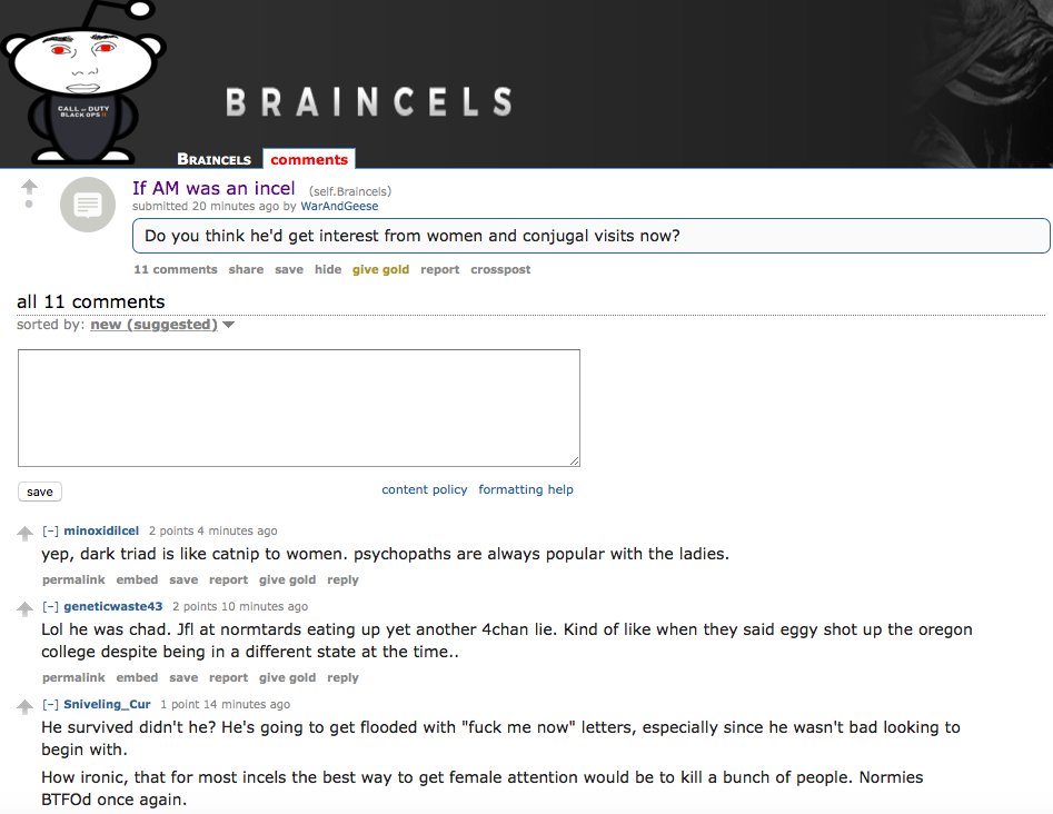 r/Braincels (the new hangout of incel culture) speculates that Alek Minassian will receive conjugal visits nowpic.twitter.com/qxROk4cweR