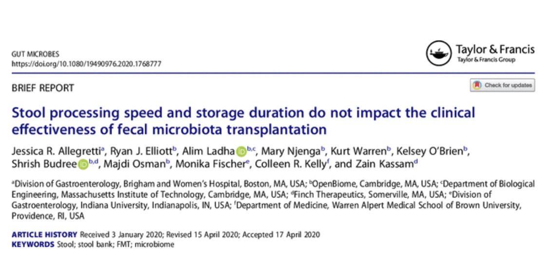 @DrJessicaA of#BWHFMT & collaborators, neither stool processing time from donation nor storage time in freezer until use was found to affect the efficacy of fecal microbiota transplantation (#FMT) for recurrent C. difficile infection. https://www.tandfonline.com/doi/full/10.1080/19490976.2020.1768777 …pic.twitter.com/RrixZ6glvj
