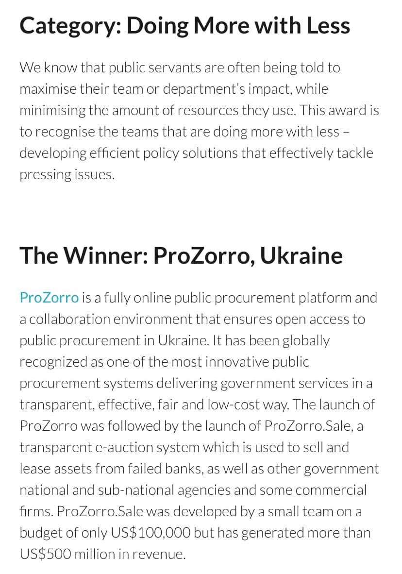 @the_prozorro and http://ProZorro.Sale for being named one of@Apolitical's Global Public Service Teams of the Year. They won the 'Doing More with Less' category. Well deserved!