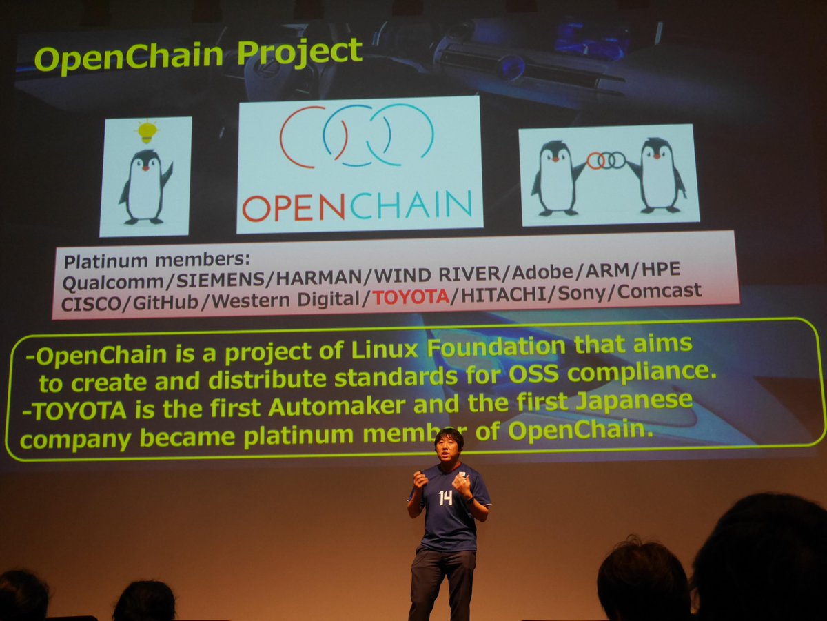 @openchainproj took center stage during Toyota's keynote at Open Source Summit Japan. Our community makes open source compliance more accessible, effective and cost efficient. Everyone is welcome! @linuxfoundation #community #Solutionspic.twitter.com/qniSJh9n2C