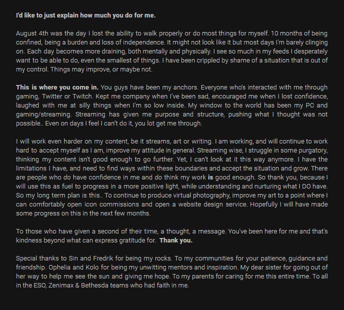 Today marks 10 months ♿️, mostly in one room, one chair. Wanted to thank you from the bottom of my heart for all that you do. There are too many words for a single tweet so.. 💜.. #Twitch #ESOFam #Disability #allwhoIcanttagpic.twitter.com/ypkuiG7xAk