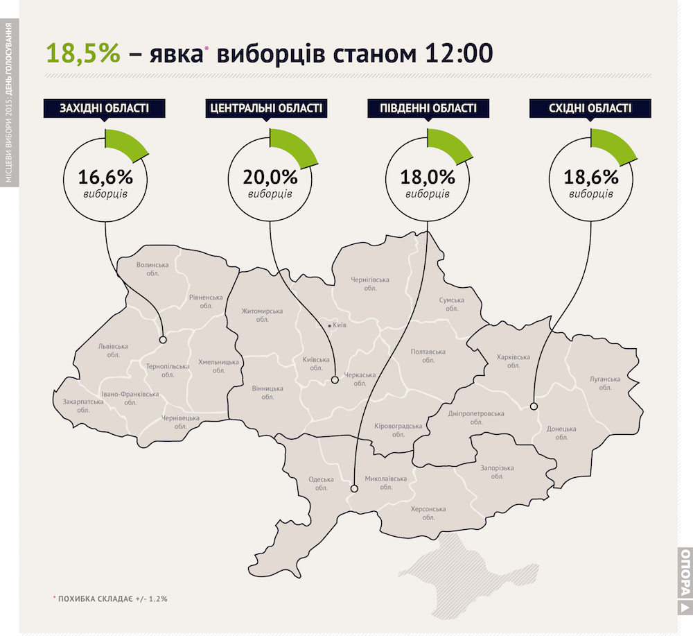 Явка, за даними ОПОРИ, станом на 12 годину – 18,5 % виборців. http://goo.gl/HDyMkx  #вибори2015 #elect_ua #oporapic.twitter.com/RtIUb4D62r