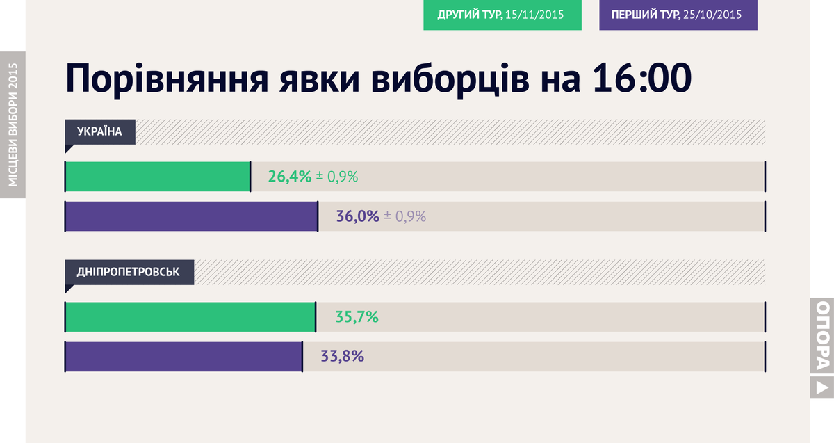 Місцеві вибори: другий тур. Явка виборців станом на 16:00 http://goo.gl/IDGgFl #вибори2015 #elect_ua #oporapic.twitter.com/aEAHVZYFs5