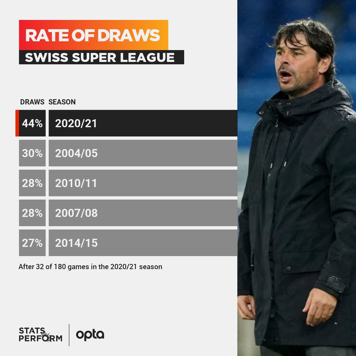 44 – This season 44% of games in the Swiss Super League ended in a draw, by far the highest rate of any season since the leagues foundation in 2003. Equal.pic.twitter.com/8k1p0srFKd
