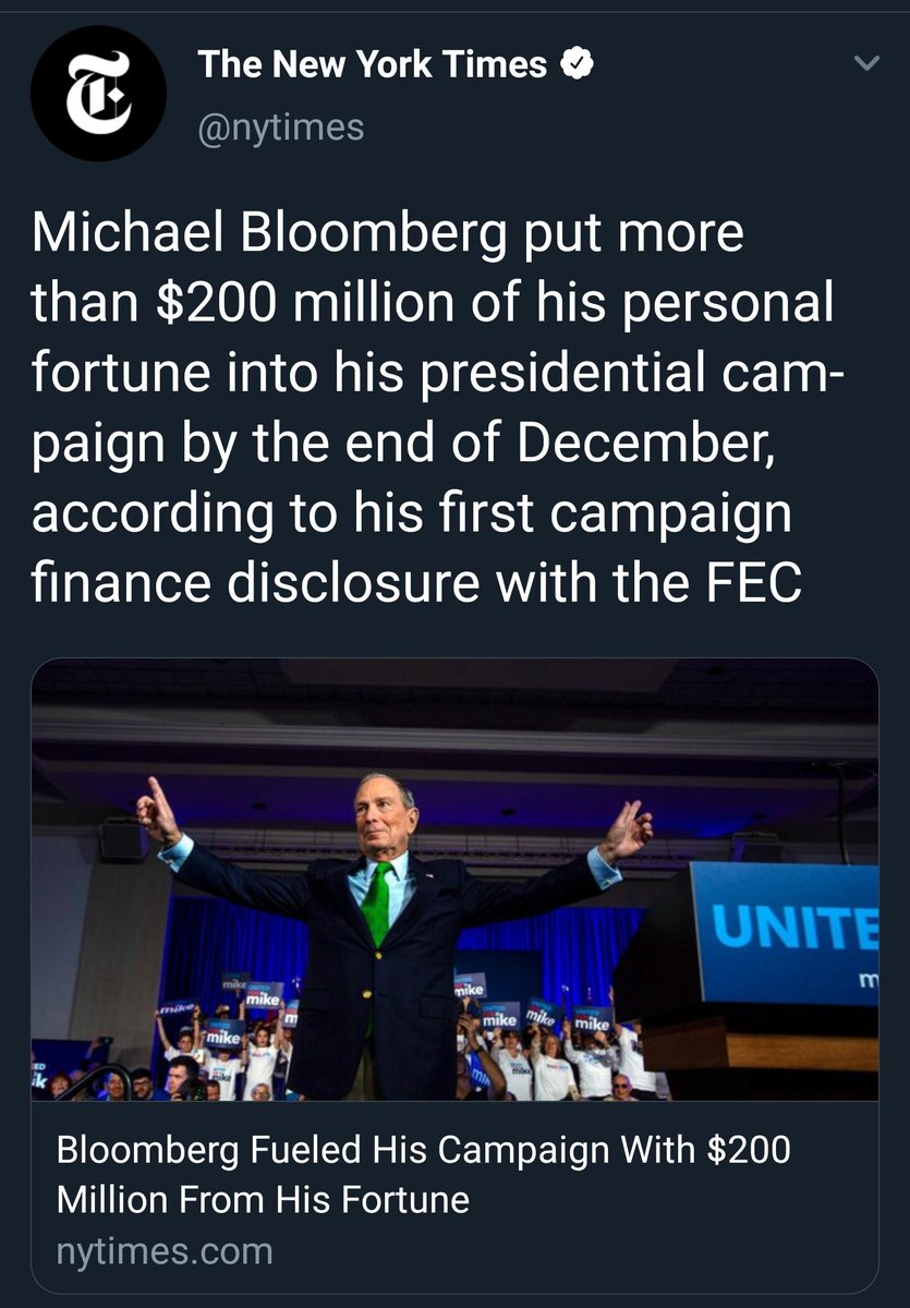 So far, Bloomberg has spent $200 million of his own money to buy his way into the election. That's 100 times (!!!) Sanders or Klobuchar's net worth. His spending forced candidates like Harris and Booker out of the race despite polling better than him... Bloomberg is an oligarch.pic.twitter.com/ZQP9VglKHU