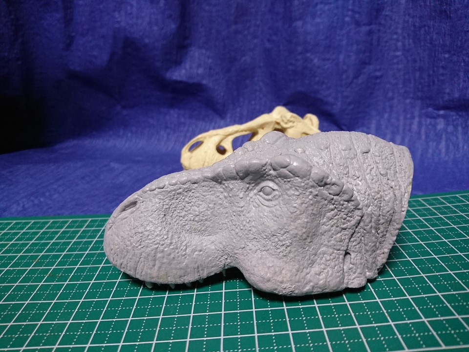 REXはREXでも(鼠)でなくて Tyrannosaurus REXを1/20で製作途中のヘッド公開、鱗か羽毛かの論争中に製作開始、立体視出来る眼球位置に拘り、今年中に仕上げられるか?後ろは山崎氏の骨格模型比較参考。