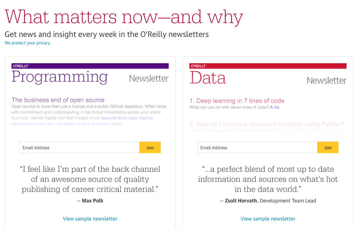 What matters now—and why? Get learning news and insight every week from the O’Reilly newsletters. http://oreil.ly/2qtiNbS