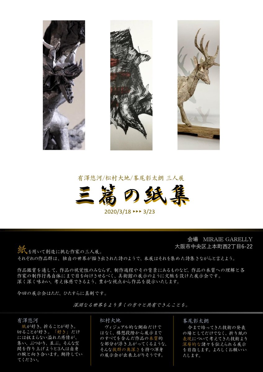 【開催告知】 紙を折る者、紙を切る者、そして紙を作る者。 ここに集いし3人の作家たちは、紙で語る詩人である。 彼らは紙を巧みに操り、独創的な世界を描き出す。 彼らの深遠なる世界がある。 その世界をなぞるように覗いてみようではないか。 いま此処に、三篇の詩が綴られる。