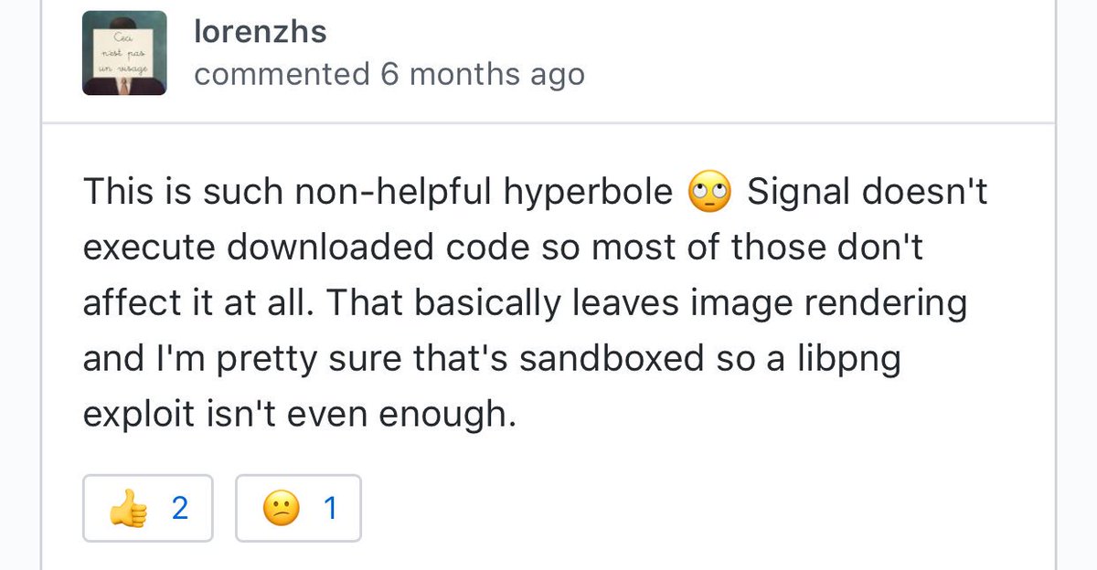 Signal desktop app is based on the insecure Electron runtime. See my report here:https://github.com/signalapp/Signal-Desktop/issues/1635 …