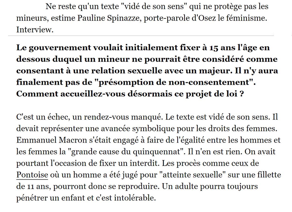 #PJLVSS a été adoptée mercredi. Ce devait être un engagement du#gouvernement, c'est un échec. Il reste tout à faire pour protéger les mineur.e.s. On considère encore que pénétrer un.e#enfant n'est pas un#crime.#GranceCauseBlablablahttps://www.nouvelobs.com/societe/20180802.OBS0472/violences-sexuelles-la-loi-n-a-pas-su-fixer-d-interdit-clair-pour-proteger-les-mineurs.html …Show this threadThanks. Twitter will use this to make your timeline better. UndoUndo -