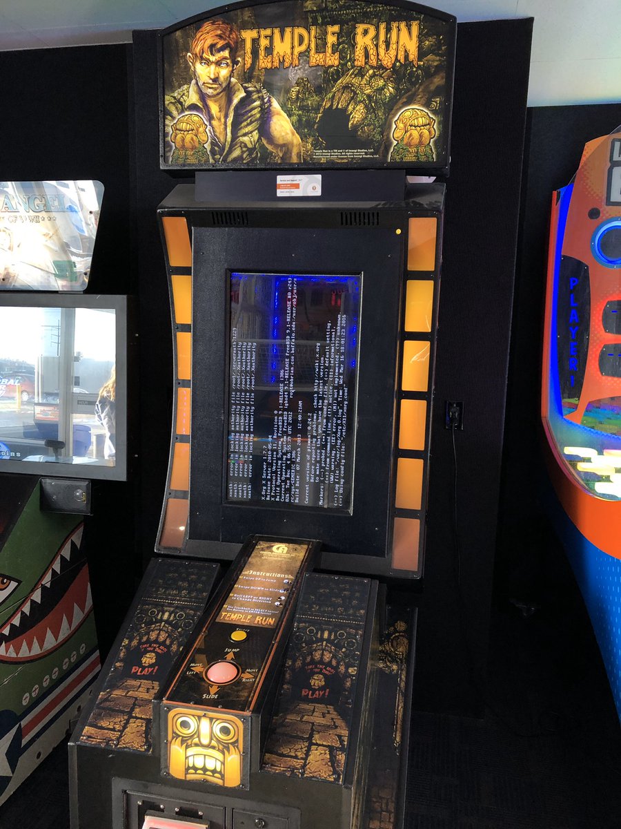 At the arcade with the kids. Temple Run fell down go boom... and for the geeks out there, apparently it runs on FreeBSD. *snort*