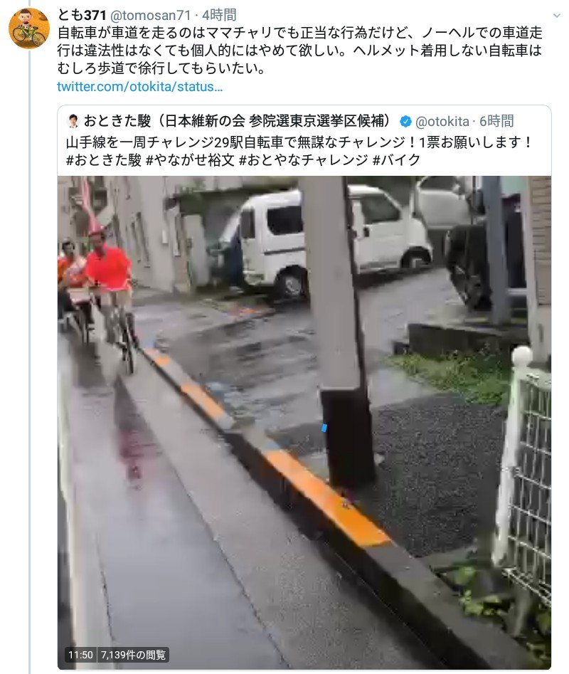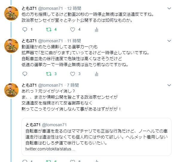 音喜多センセイ!↓この動画TWをツイ消ししたのは自転車と選挙カーの一時停止無視の指摘があったからなのですか?黙ってツイ消しして、なかったことにしようとするのは如何なものかと思いますよ!pic.twitter.com/VwMsXCXl95