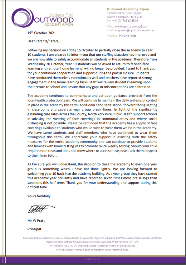 Good news! Year 10 are able to return to the Academy earlier than planned - please see the attached letter for further information