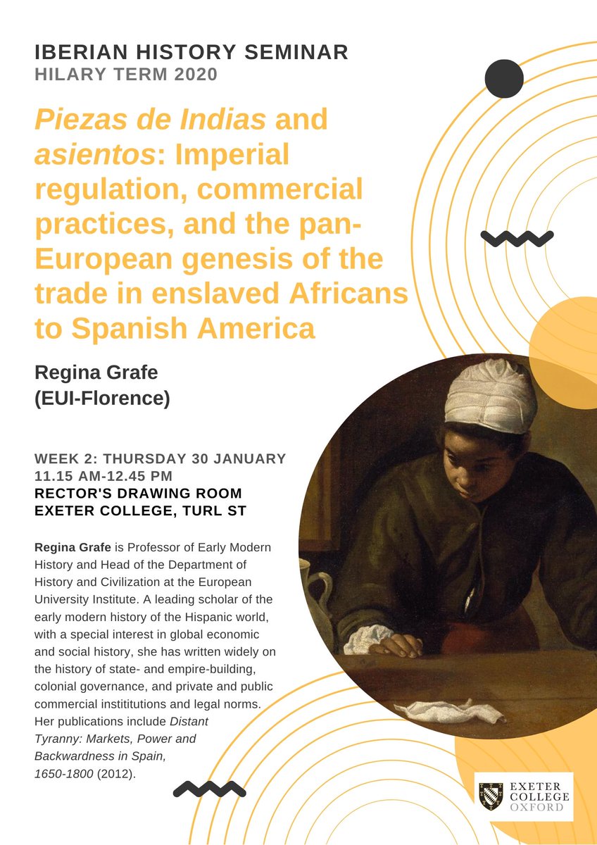 Iberian History Seminar: Regina Grafe on 'Piezas de Indias and asientos: Imperial regulation, commercial practices, and the pan-European genesis of the trade in enslaved Africans in Spanish America’. #globalhistory 11:15am | Rector's Drawing Room, Exeter Collegepic.twitter.com/JH1ERr3veT