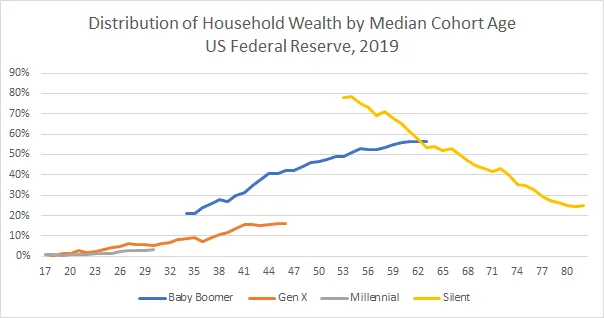 The result: Wealth has not shifted through to the next generation. Because of slowing growth, less opportunities and boomers staying in the most lucrative positions, boomers share of wealth has increased 5% as they age (for the same age range, silent gen wealth dropped 26%)pic.twitter.com/vhP4Gick3b