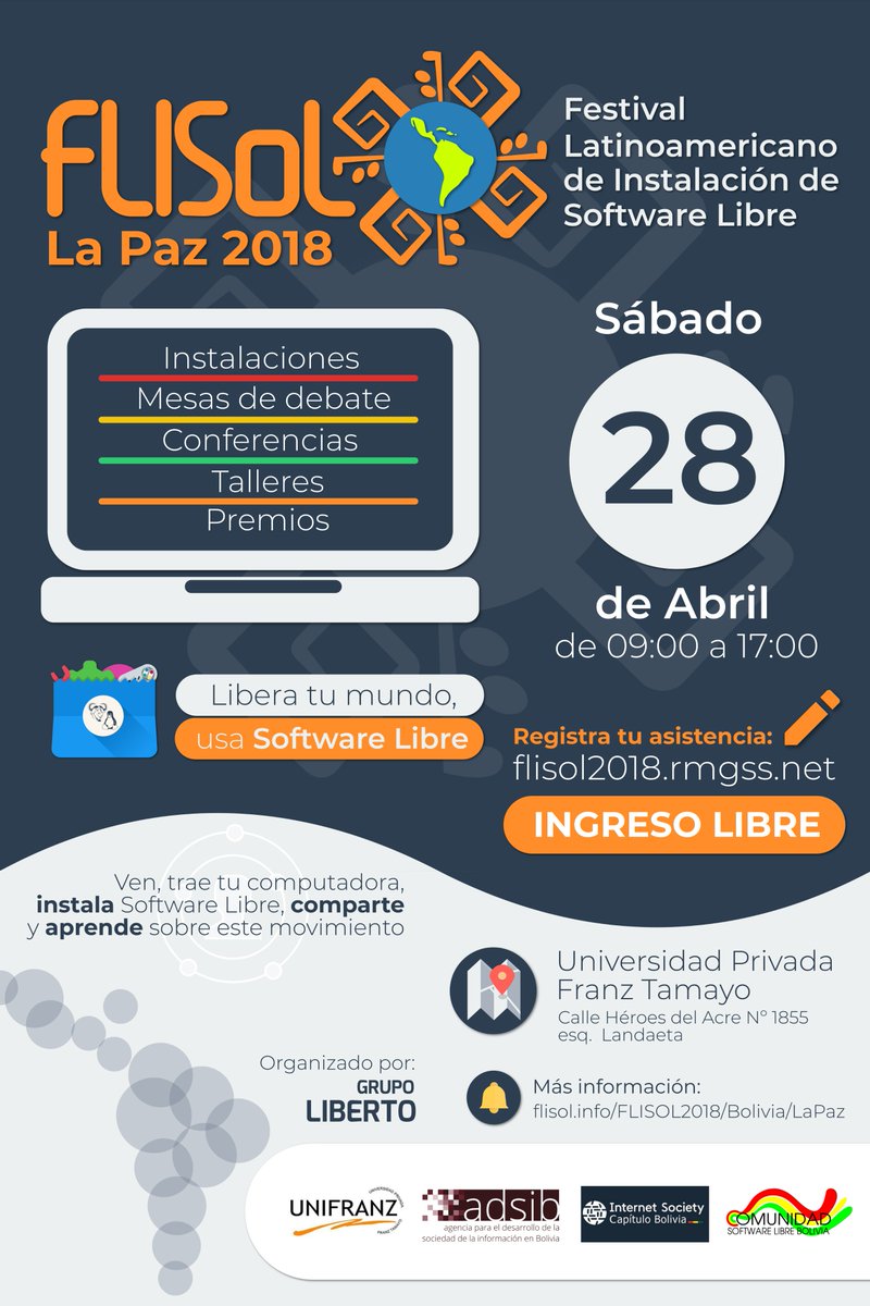 I would to invite all the communities to the #FLISOL (Latin American festival of free software installation) #LaPAZ #FreeSoftware and see it via #Periscope