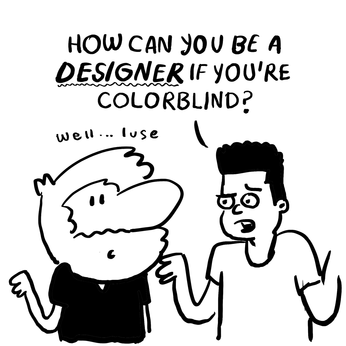 Me: I'm colorblind People: How can you be a designer if you’re colorblind? Do you see everything in black and white? How do you match your clothes? How many fingers am I holding? What color is my shirt? What about that dog? How can you drive? Are you faking it? Can u see me?