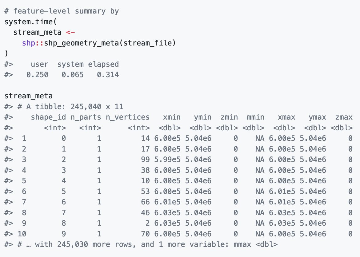 in the works (only reads geometry/file meta at the moment!) https://github.com/paleolimbot/shp pic.twitter.com/CMkYFCBb0P