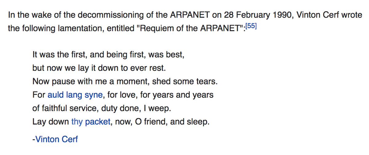 "Requiem of the ARPANET", by Vint Cerf https://en.wikipedia.org/wiki/ARPANET#Technology …pic.twitter.com/5BiFzRjbtF