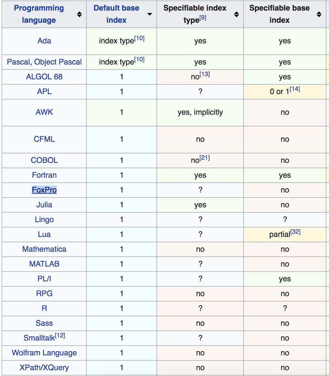 TIL: There are quite a few languages with 1-based indexing, including more recent languages. (And some where you can pick!) https://en.wikipedia.org/wiki/Comparison_of_programming_languages_(array)#Array_system_cross-reference_list …pic.twitter.com/lTo1QUuPOr
