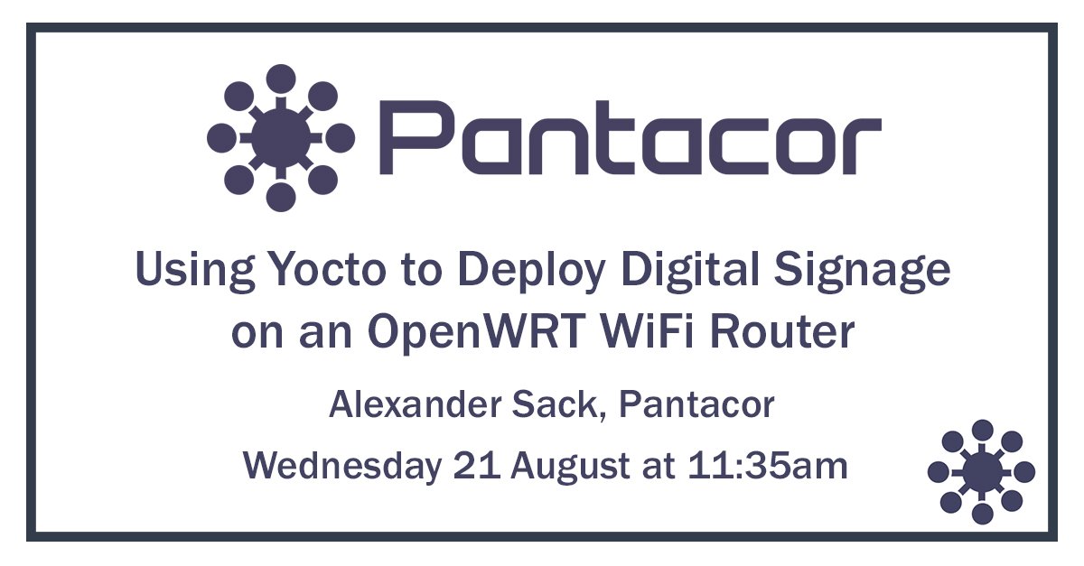 Looking forward to talking Using Yocto to Deploy Digital Signage on an #OpenWRT #Wifi Router, today at 11:35am https://sched.co/PUVR @linuxfoundation #lfelc @asacasa #ossummit #lfelc #Pantacorpic.twitter.com/iZ0NbTx0tx